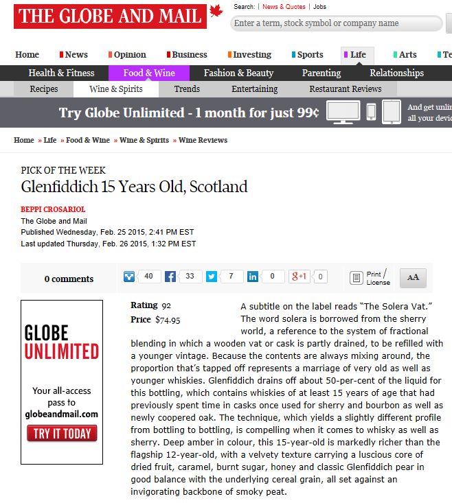 Canadian Media Coverage for Glenfiddich – Globe and Mail